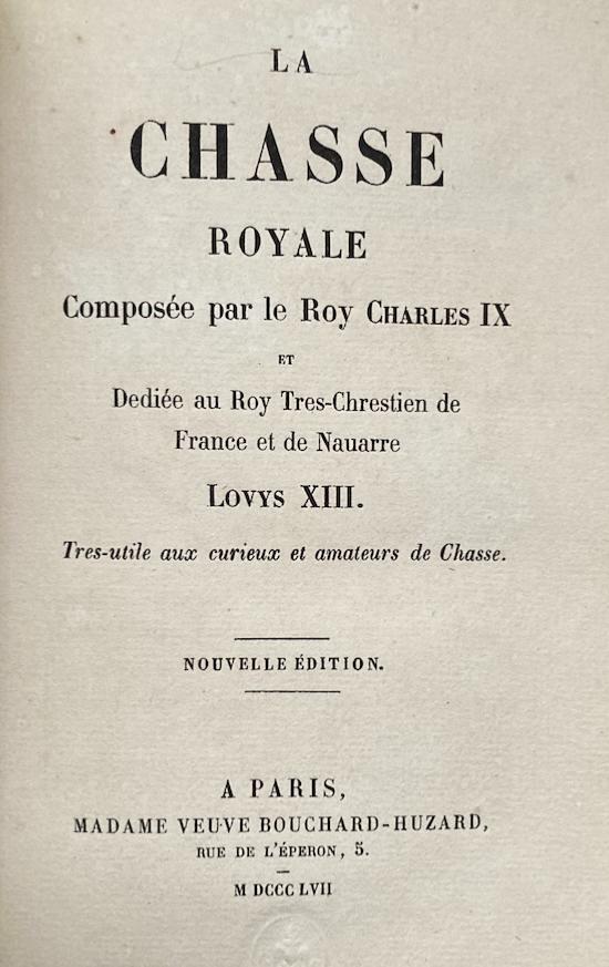À la fin de l'ouvrage, la longue note de Louis Bouchard-Huzard (1824-1873) donne les sources permettant de l'attribuer avec certitude au roi Charles IX lui-même et présente l'esprit de cette réédition. Le grand imprimeur, libraire et éditeur, l'a effectuée sur l'exemplaire de son grand-père, le vétérinaire et bibliophile Jean-Baptiste Huzard, et l'a voulu d'un format identique, avec le texte exact (y compris les fautes typographiques), la même vignette ainsi qu'un papier semblable à celui de l'édition de 1625.