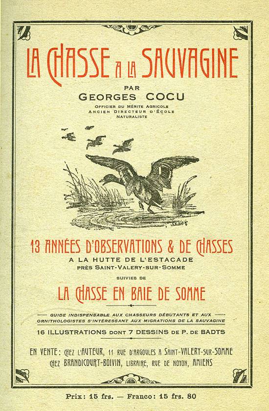 • <i>G. Cocu</i><br>La chasse à la sauvagine.<br>13 années d'observations et de chasses<br>à la hutte de l'Estacade<br>près Saint-Valery-sur-Somme…<br>La chasse en baie de Somme