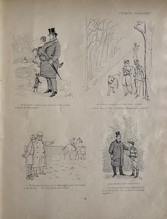 Éditions originales. Réunion de 3 merveilleux albums humoristiques de Crafty (dessins en noir légendés) évoquant la vie de la bonne société à la fin du XIXe siècle à travers les multiples péripéties et accidents subis par les possesseurs de chiens d'agrément et par les cavaliers.