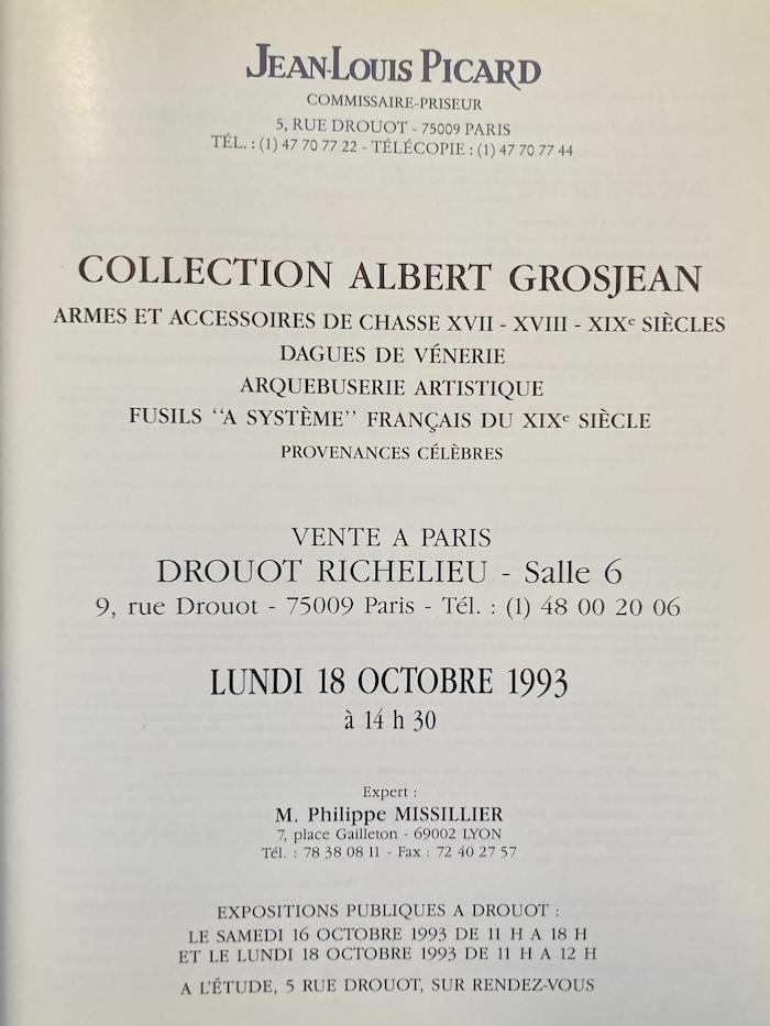 Catalogue de la vente aux enchères de la très belle collection d'armes de chasse anciennes d'Albert Grosjean, du XVIIe au XIXe siècle.