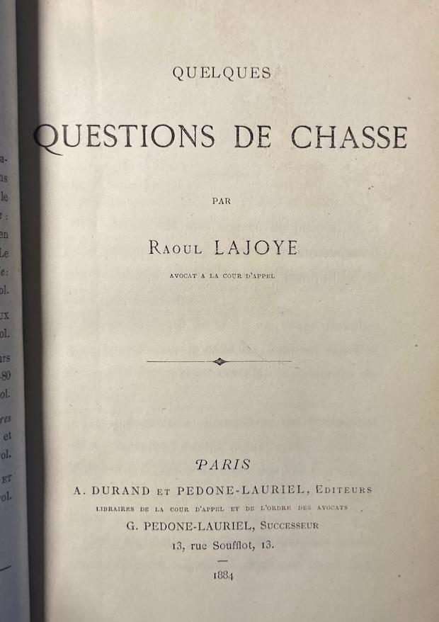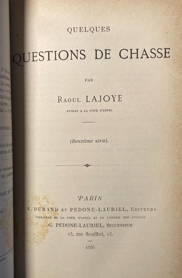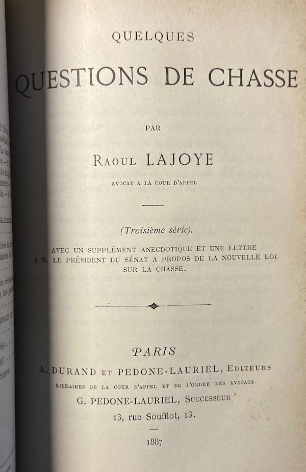 Éditions originales des 3 séries d'anecdotes tirées des procès de chasse de l'époque. Raoul Lajoye était avocat et a puisé des récits et des réflexions sur la chasse dans l'actualité juridique de son temps : braconnage, accidents de chasse, questions de gibiers, problèmes de chiens, etc.